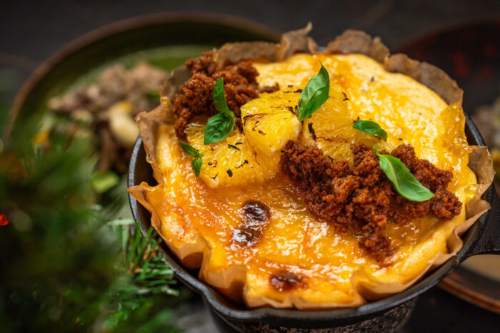Met pompoencrème, tutti frutti en een saus van cognac.