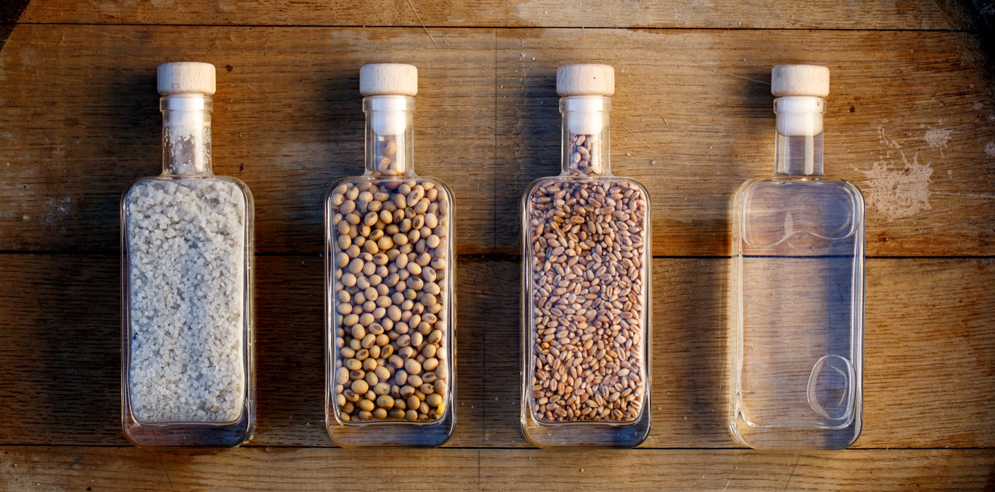 Dit resulteert in lokaal geteelde en zorgvuldig geselecteerde sojabonen en tarwe. Deze twee ingrediënten worden gecombineerd met bronwater en natuurlijk grof grijs zeezout, geoogst in Bretagne, Frankrijk.