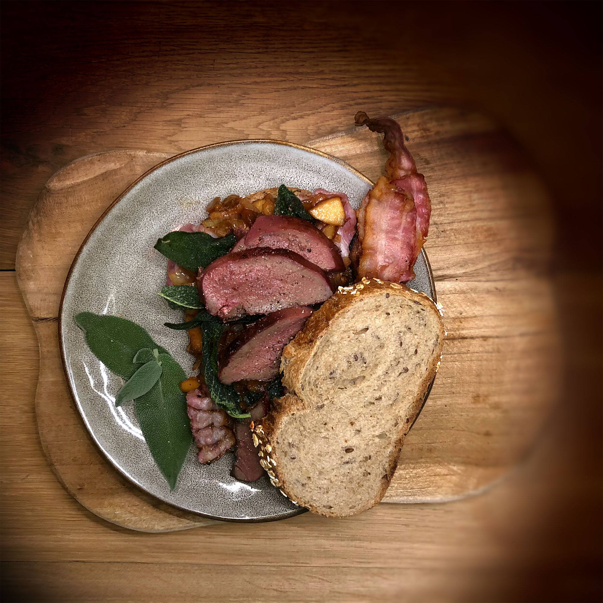 Nu is het nog een kwestie van je broodje bouwen. Snij dikke boterhammen van je favoriete brood. Leg op de onderste boterham 2-3 stukken krokante spek. Schep hier de uiencompote over en leg er de salie op. Trancheer de lever in kleinere stukken zodat deze beter zijn te verdelen op het brood. Dek het geheel af met een tweede dikke boterham. Eet smakelijk!