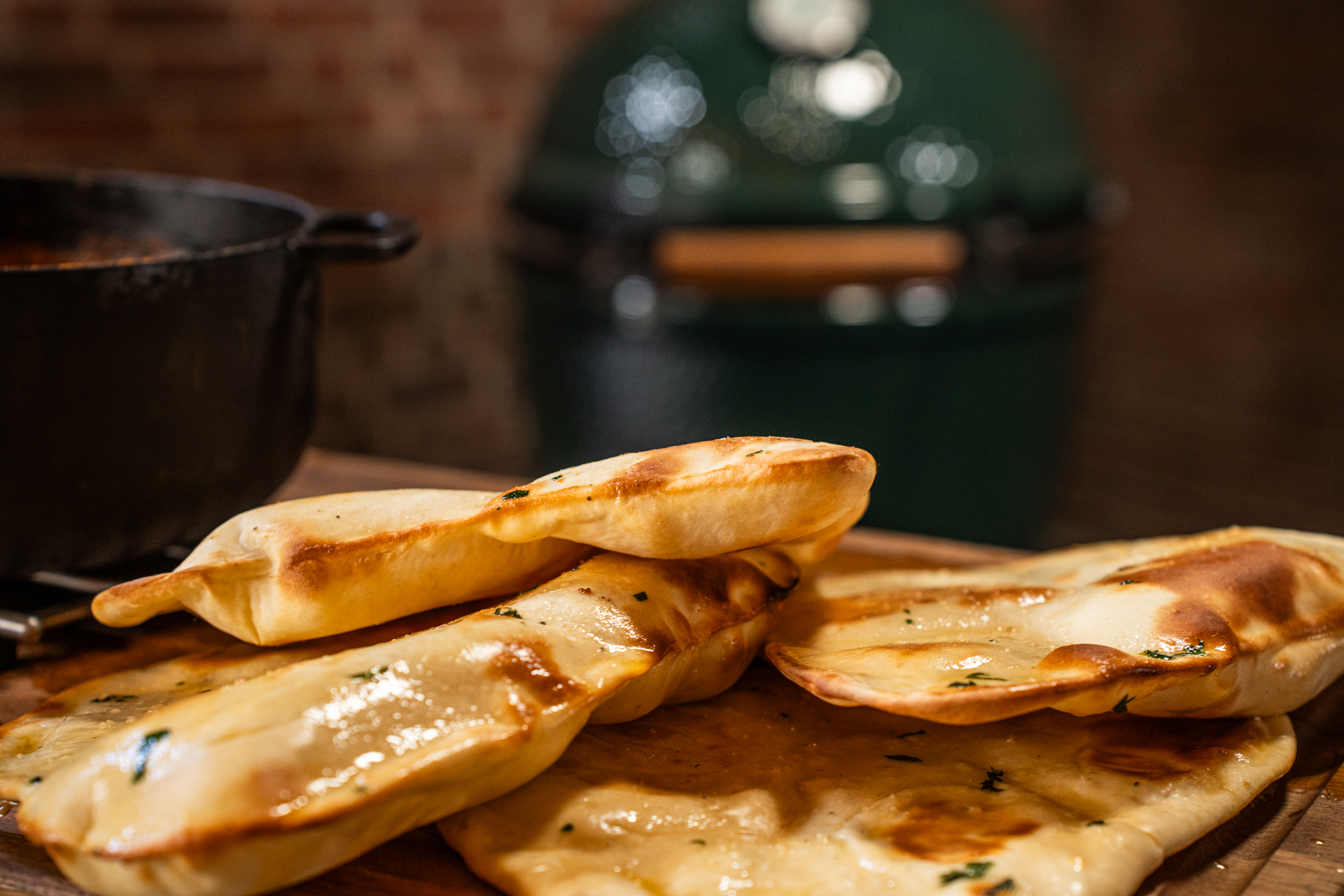 We gaan nu de knoflook boter maken. Zorg voor plakjes knoflook en voeg deze in de skillet samen met de boter en bengali curry powder toe. Verwarm het geheel totdat het smelt en de knoflook licht geroosterd is, zodat de smaken van de rub goed worden opgenomen. Dan heb je straks lekkere boter om de naanbroden mee in te kwasten. Het moment is daar, de kip mag na ongeveer 5 minuten uit de BBQ. Vervolgens zet je de pizza opstelling de BBQ om straks de naanbroden op te bakken. Vergeet niet de schuif onder je BBQ en schoorsteen open te zetten. Zo kan de BBQ 15 minuten voorverwarmen op 250 graden. Vervolgens ga je terug naar de kippendijen en snij je deze in grove stukken, zodat je nog wel een lekker bite hebt! En voeg de kip toe in de Dutch Oven met de saus. Zet vervolgens de skillet met knoflookboter op je pizzasteen in de BBQ, voor het naanbrood straks. Daarna snij je wat kleine blokjes boter voor in de saus.