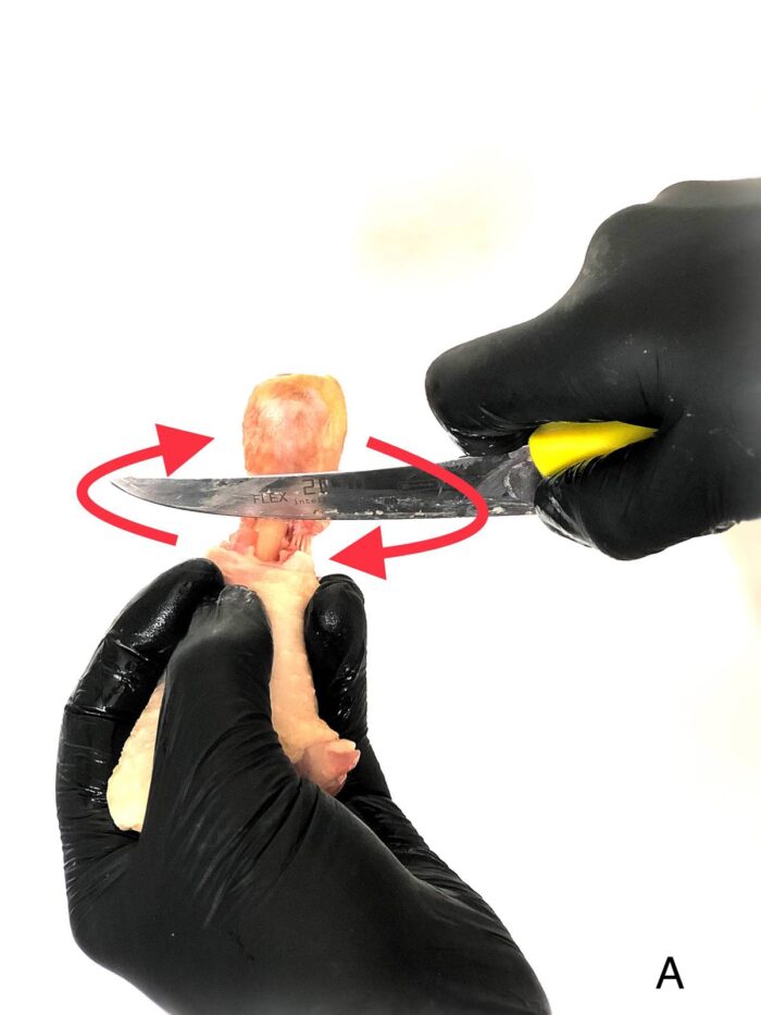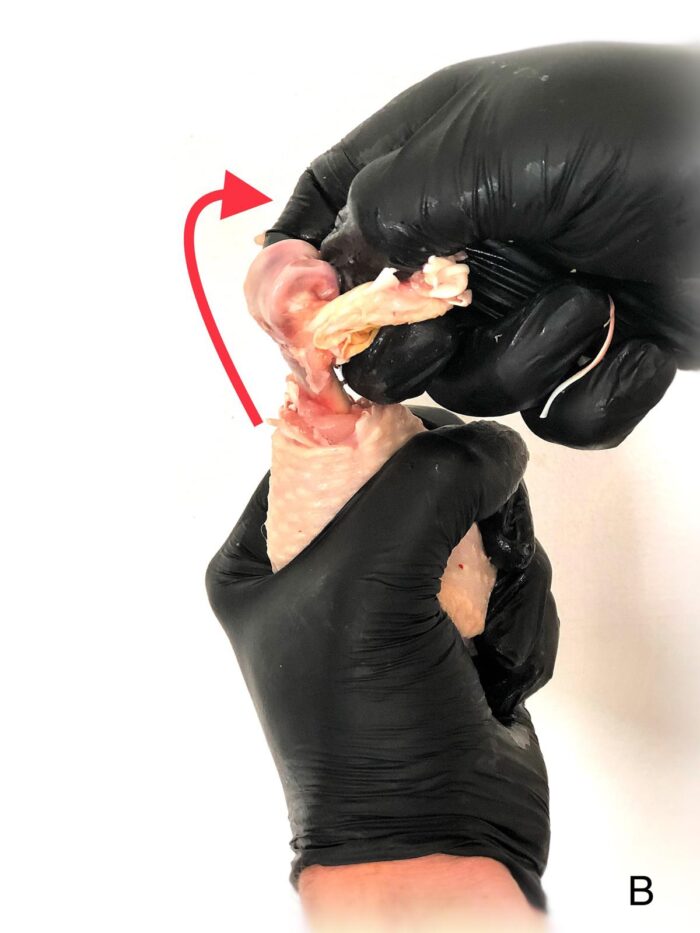 Het makkelijke van de Chicken Lollipop is dat je ,met een handigheidje, een stukje vlees van de drumsticks verwijder en daardoor een schonere houvast hebt tijdens het kluiven. Voor het prepareren van de drumsticks snijden we met een goed scherp mes rondom bij het dunne gedeelte tot op het bot. Dit doen we zo’n drie centimeter vanaf de bovenkant van het bot (foto A) Snij rondom goed door aangezien hier enkele pezen zitten waar soms moeilijk doorheen te komen is. Het vlees trekken we nu van het bot en over het kogelgewricht heen. Hier is wat kracht bij nodig om de aanhechtingen los te trekken (foto B). Het botje schonen we nog wat op en duwen het overige vlees naar beneden. Hierdoor komt wat meer bot vrij en blijft de Chicken Lollipop beter staan.