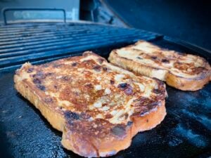 Je wilt natuurlijk wel dat je wentelteefjes goed krokant zijn, dit gaat het beste op een vlakke bakplaat, zoals bij de OFYR of een Traeger Ranger. Wanneer je een kamado hebt, kan je een gietijzeren plancha gebruiken. Deze zijn handig om groentes, een eitje, vis of burgers mee te bakken. Met de platte kant krijg je maximale toast en dus ook de optimale smaakbeleving. Met de geribbelde kant heb je minder contact, maar wel een mooie grillstreep. In dit recept gebruiken we beide kanten.
