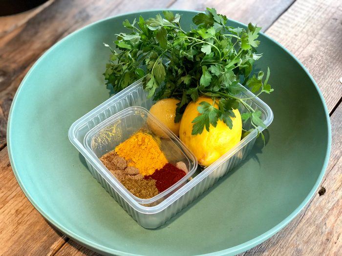 - Voeg alle droge kruiden toe, sap en rasp van de citroen en meng dit goed met elkaar.