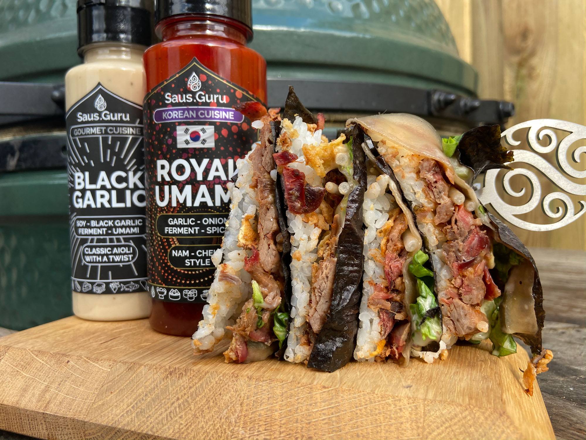 Start met een vel nori en druk hier de sushirijst op. Strooi dan wat gebakken uitjes er overheen, gevolgd door pulled beef. Drizzle nu nog wat black garlic saus over het vlees zodat de zoet zure komkommer uit BBQ-jars erop blijven plakken, snij nu de little gem in fijne reepjes en strooi die er nog over. Leg nu het tweede vel nori erop en druk zachtjes aan. Gebruik een scherp schoon mes om het vel te delen. Je kunt er of vierkantjes of drie hoeken van snijden.