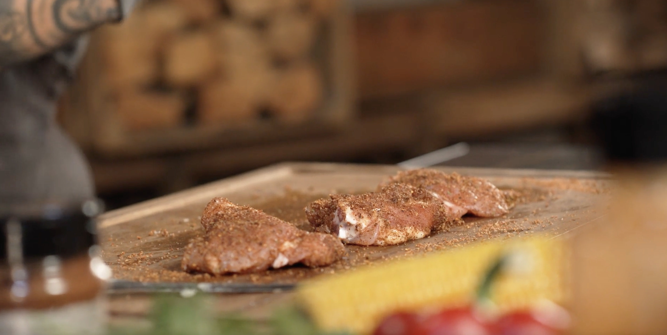 We starten het recept met het bereiden van de pulled chicken, dit heeft namelijk het langste nodig. Hiervoor gebruiken wij kippendijen met vel en bot, dit zorgt ervoor dat het vlees niet snel uitdroogt. Het velletje kan je heel makkelijk verwijderen door je vingers tussen het vel en het vlees te doen. Breng royaal de Mexican rub van Angus & Oink aan op de kippendijen.