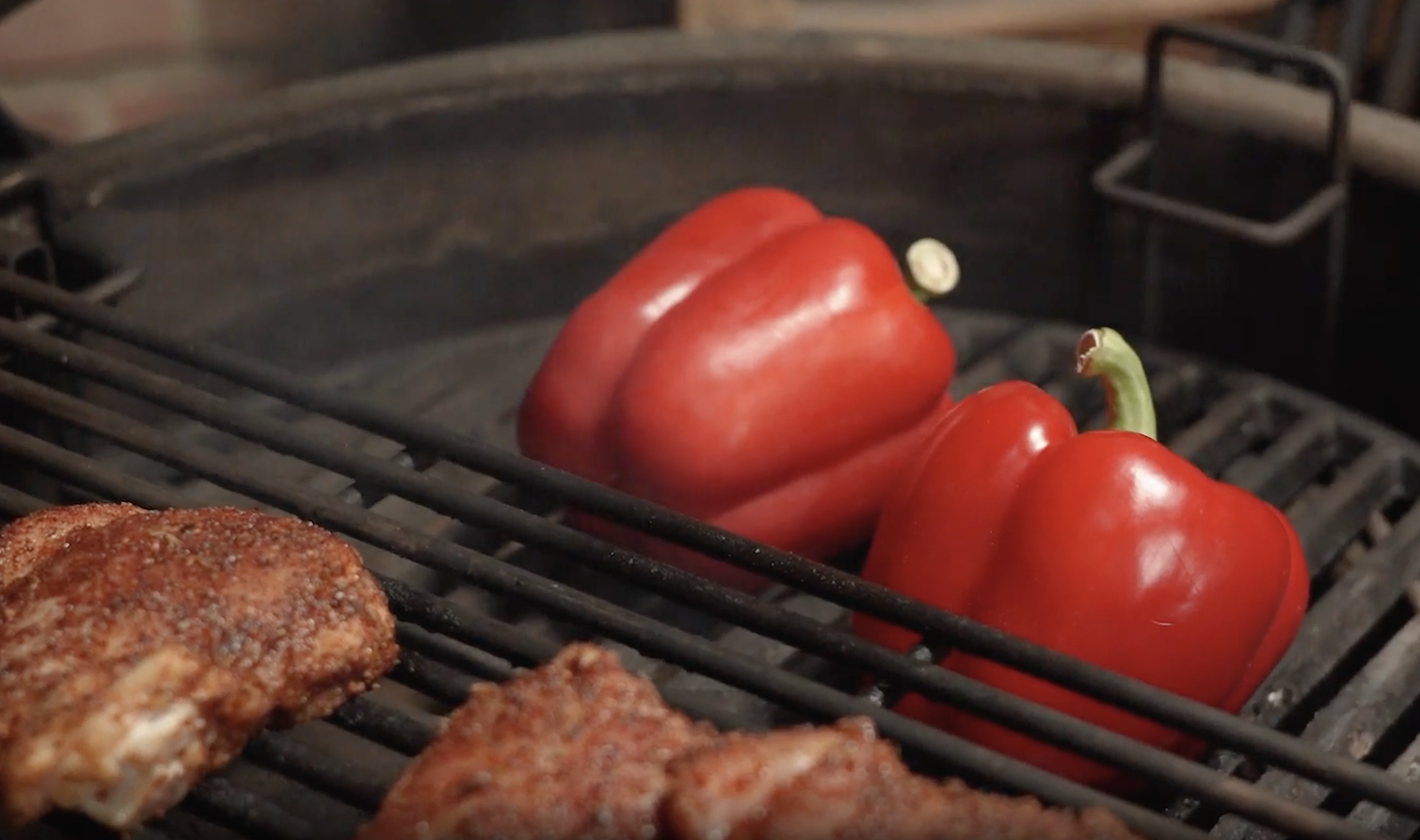Plaats de paprika’s op het rooster en pof ze tot ze volledig gaar en zwart geblakerd zijn. Doordat de kippendijen op de BBQ liggen, is de temperatuur iets lager. Het duurt dan ook iets langer voor dat ze zwart zijn. Wanneer ze zwart geblakerd zijn, halen we het velletje eraf en zijn ze mooi zacht voor in de salsa.