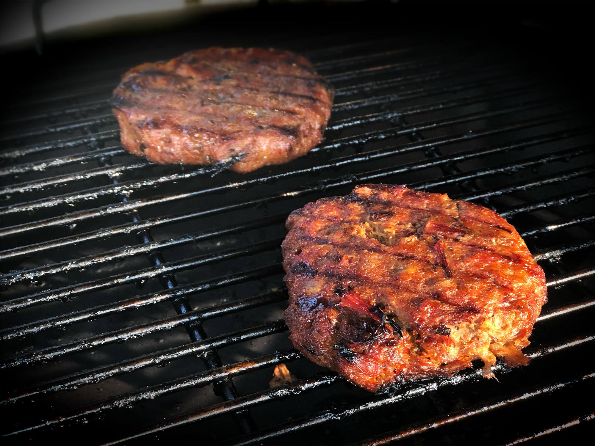 - Maak hierna het rooster weer schoon en leg de vier burgers er op. Voor een grillruit draaien we na zo’n twee minuten de burgers een klein slagje. Na nog eens twee minuten kunnen de pulled pork burgers omgekeerd worden met de spatel. Ook voor deze kant draaien we de burgers na twee munten een klein slagje. Om zeker te zijn dat het vlees de juiste gaarheid heeft, gebruiken we de kerntemperatuur meter om dit te checken. Mijn persoonlijk voorkeur bij hamburgers is 64 graden kern. Hierbij is de burger in het midden nog licht rosé en heeft daardoor net wat meer smaak.