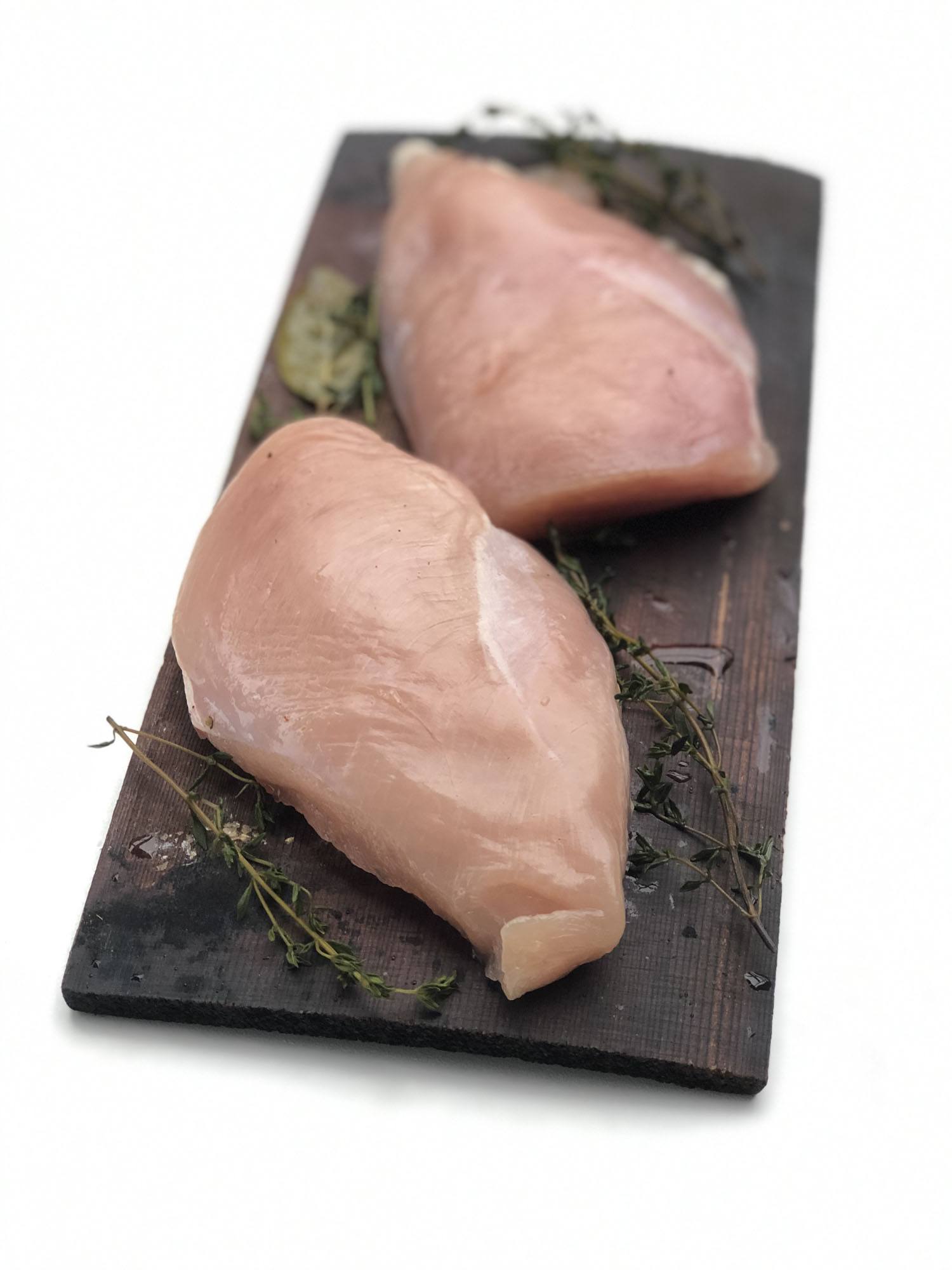 Bij een stabiele 100 graden leggen we een appelrookhout Chuck tussen de gloeiende kolen. Iedere milde houtsoort kan voor kip roken gebruikt worden. Op het moment dat er goede witte rook uit de kamado komt, kunnen we de kipfilet vanuit de koelkast op de barbecue leggen. Voor extra smaaktoevoeging gaat de filet op een cederhouten rookplank met daartussen enkele takjes rozemarijn. Het hout heeft geen directe toevoeging maar zorgt dat de kruiden onder de kip op hun plaats blijven. Plaats meteen je kerntemperatuur meter en stel deze in op 75 graden Celsius.