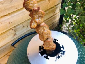 Haal de folie van de gemarineerde varkenshaas en rijg de blokjes mét aanhangende marinade aan de spiesen van de tandoorset. Verwijder de top vent van de kamado en plaats de tandoor ring. Hang de spiesen met de varkenshaassaté in de ring en laat zo’n 15-20 minuten garen of tot het vlees goudbruin is en een kerntemperatuur van 55 oC heeft behaald. Controleer tussendoor af en toe of de garing gelijkmatig gaat en de saté niet verbrand. Dikke tip! De spiesen worden bloedheet, gebruik dus altijd een vuurvaste handschoen.