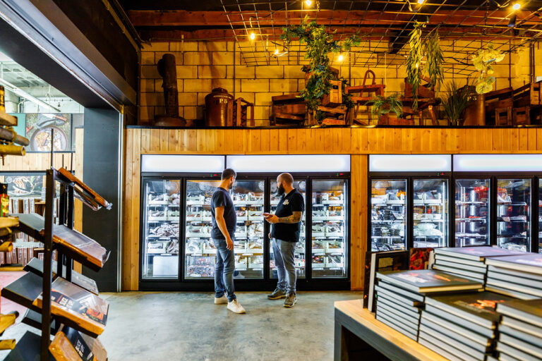 Natuurlijk kun je even snel een zak houtskool halen, maar waarom niet meteen een gesprek aanknopen met een van onze chefs om advies te krijgen over jouw gerecht? Plof gerust neer met een kop koffie, blader door een boek en laat je inspireren. Neem gerust de tijd, gemiddeld blijven bezoekers meer dan 2 uur – en dat zegt genoeg!