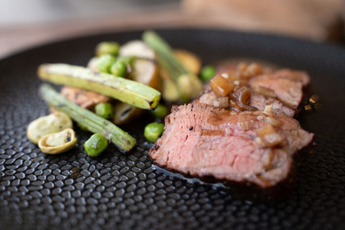 Met geroosterde peulgroenten, gepofte krieltjes en bordelaisesaus